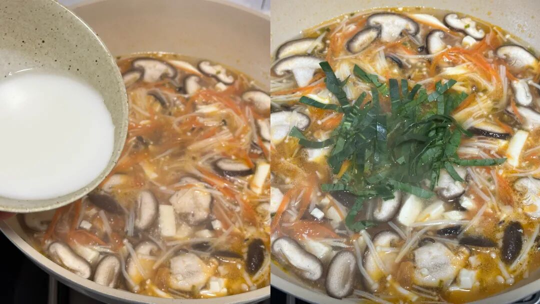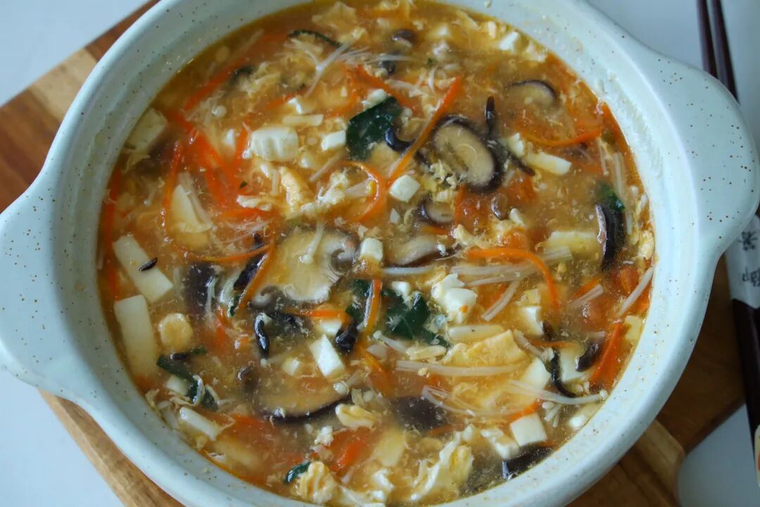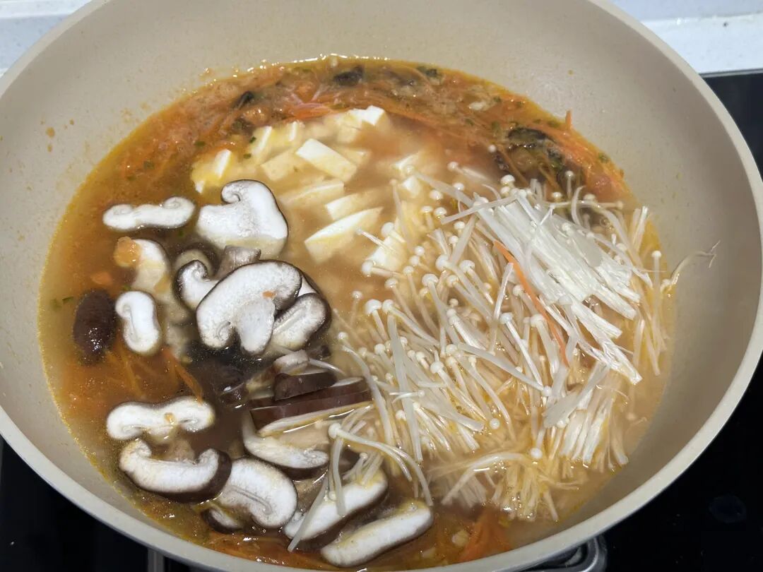 这汤的食材特别丰富,光看着就让人心情好。金针菇嫩嫩的,木耳滑溜溜的,胡萝卜丝带着甜味,香菇片厚实有嚼劲。最妙的是那一盒内酯豆腐,煮在汤里又软又滑,用勺子都得轻轻舀,不然就碎了。再加上红彤彤的西红柿,煮出来的汤底带着天然的酸甜,特别开胃。