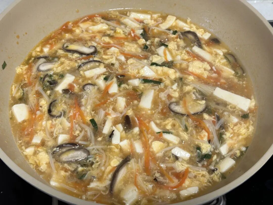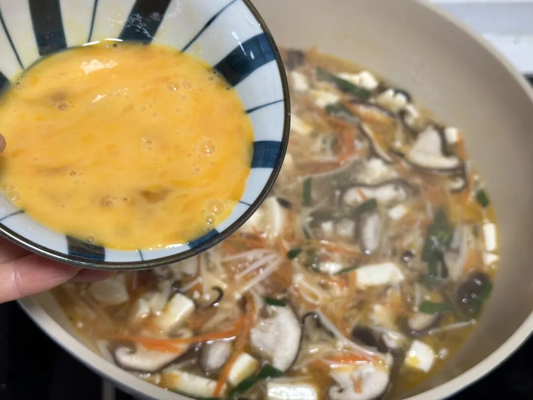 要说这汤有多好喝,那真是谁喝谁知道。西红柿熬出的汤底,颜色漂亮,味道也浓郁,完全不需要加什么复杂的调料,一点生抽一点海盐就足够了。各种蔬菜在汤里煮过之后,各自的味道都融在了一起,却又保持着自己的特色。金针菇还是脆生生的,木耳带着点弹性,豆腐几乎入口即化。最后淋上的蛋花,像一层薄薄的金色纱幔,让整锅汤看起来更加诱人。