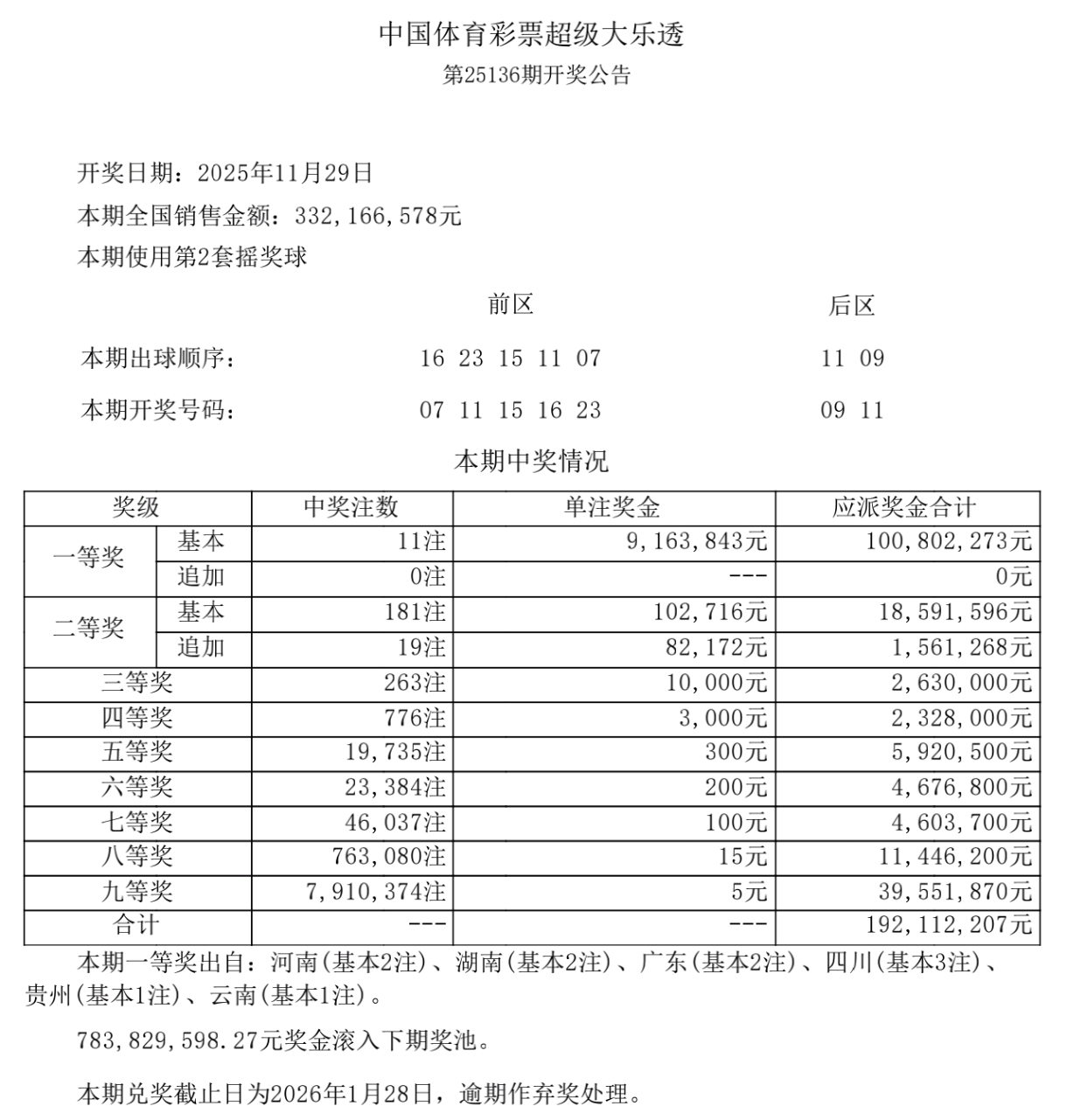 大乐透第25136期开奖揭晓:一等奖开11注,四川彩友独中2749万元