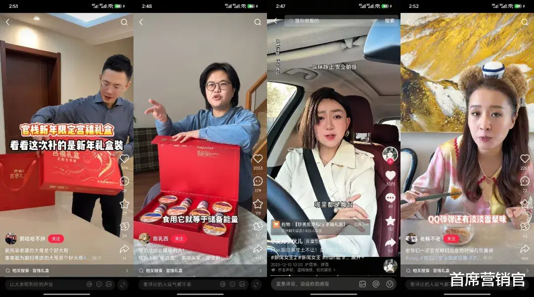 而联动抖音音乐达人推出改编版《恭喜你》,则将“官栈花胶宫禧礼”与 “官栈花胶恭喜你” 深度绑定,用喜庆洗脑的唱段加深用户对“宫禧礼盒”的记忆;