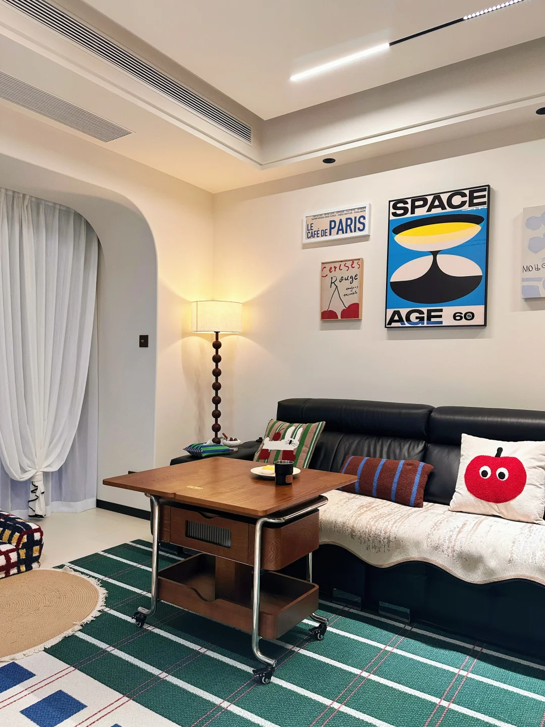 还可以移来移去的,收拾地面卫生的时候也很方便,不用的时候可以推在一边,空间就不会那么局促了。