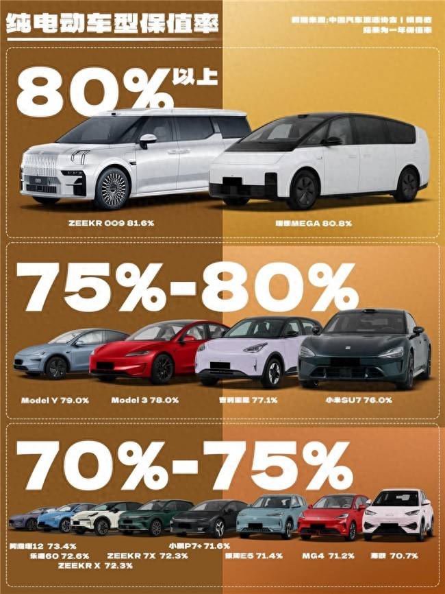 80%+ 梯队就俩车,极氪 009 直接以 81.6% 的一年保值率登顶国产纯电第一,比理想 MEGA 还高一点,特斯拉都被甩在后面~