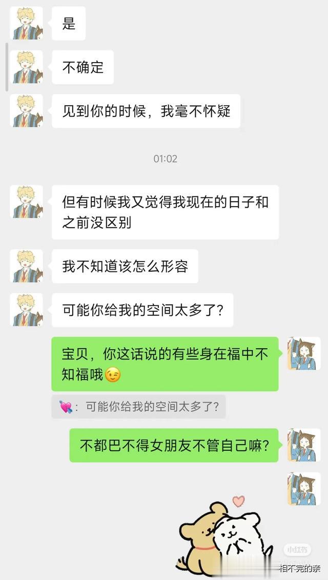 每个人的看法和想法都不一样嘛,至于我的措辞,因为有时候我说话就喜欢装装的,特别是恋爱里,我喜欢营造那种感觉。而且就像有的情侣喜欢恨不得每时每刻黏在一起,但我就不喜欢,个人选择而已啦。