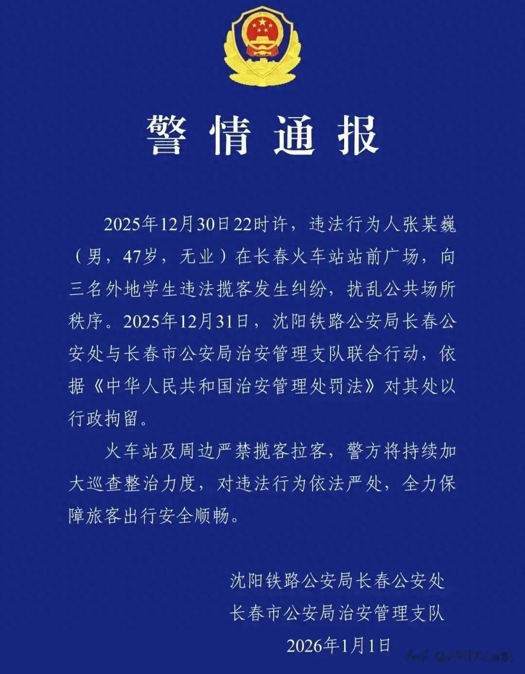 冲突的时间:2025年12月30日22点之后。地点:长春火车站出站口的站前广场。涉事的揽客黄牛:47岁,无正当的职业。12月31日,在有力的视频证据面前,当地警方经过多方排查,立马对涉事男子进行了行政拘留。