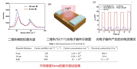 在该研究中,霍尔测试的主要目的是测量二维Bi的载流子浓度、载流子迁移率和电导率等电学参数,这些参数对于理解二维Bi的电学性质以及其在光电探测器中的应用至关重要。例如,载流子迁移率决定了载流子在材料中的传输效率,而载流子浓度则影响了器件的光响应度,如图1所示。