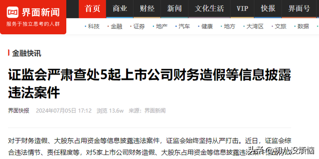 证监会严肃查处5起上市公司财务造假等信息披露违法案件——界面快报 2024年07月05日