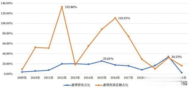 这种明显异常的商业模式持续了整整13年,这种模式下,公司2009至2021年间累计虚增营收103.33亿元,虚增成本93.99亿元,虚增利润9.34亿元,其中某些年份,虚增利润甚至超过了公司实际利润,最高达到实际利润的132%,这意味着财报上的盈利数字大半都是注水的。