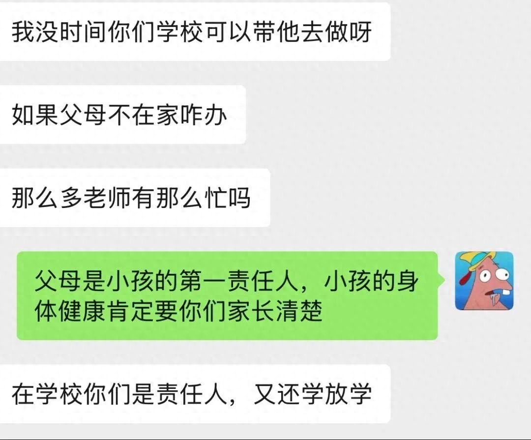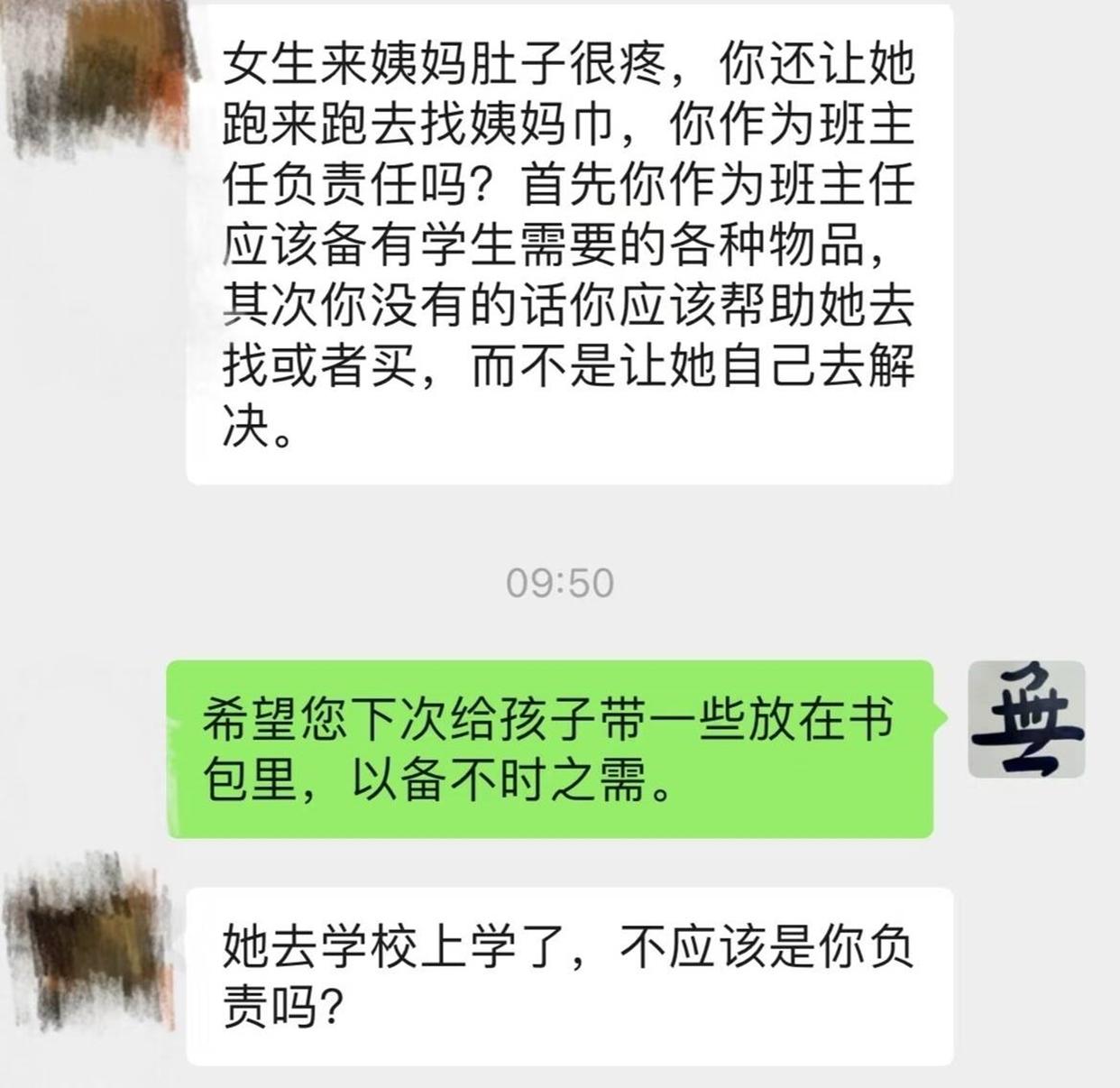 结果,该家长仍然不依不饶地追问:“你作为班主任应该备有学生需要的各种物品,其次你没有的话你应该帮助她去找或者买,而不是让她自己去解决。”