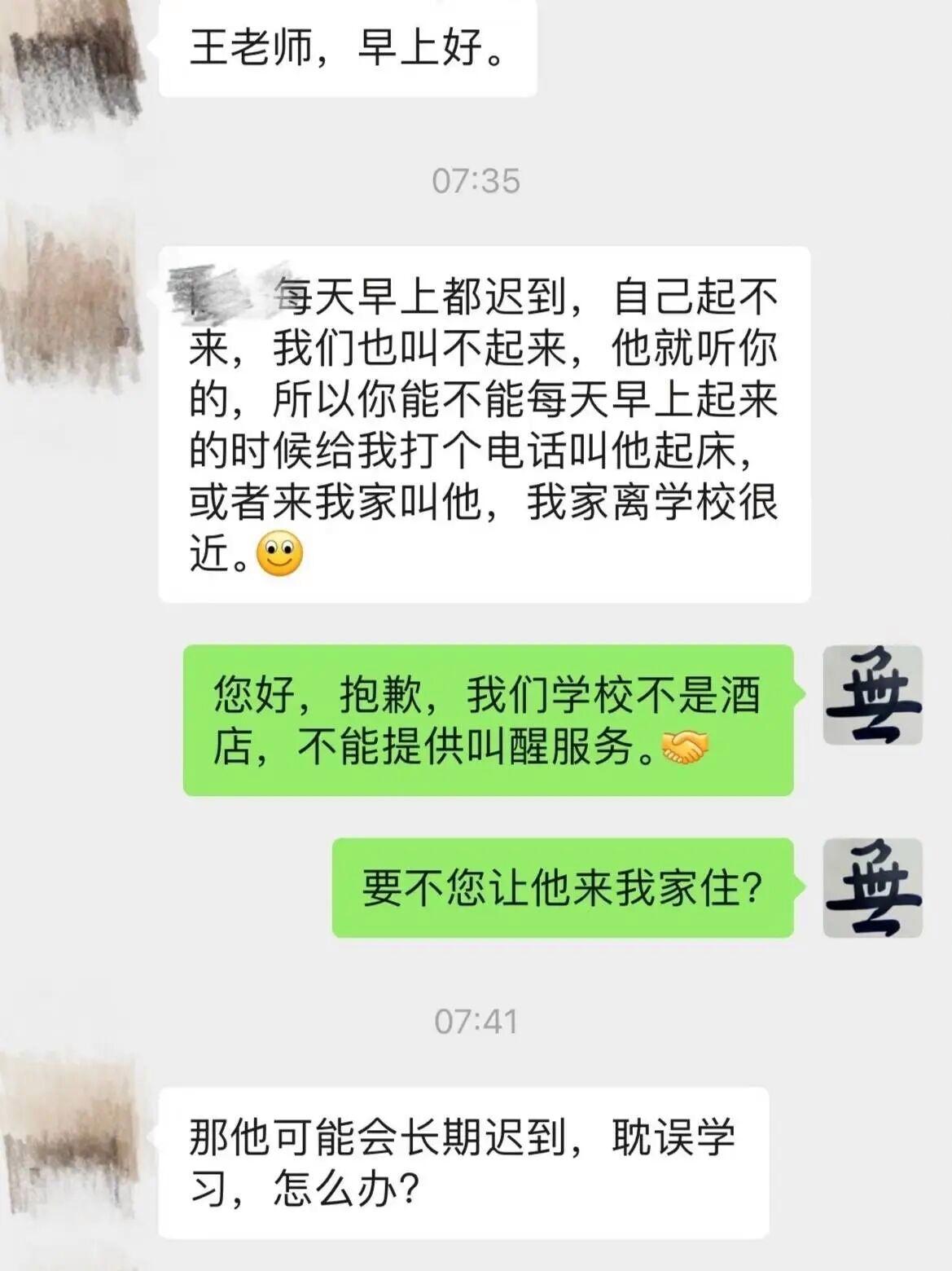有网友一开始以为王老师是女班主任,还觉得家长的要求勉强有几分道理,得知是男老师后,只觉得这要求离谱得没边,别看这只是短短的几句话,但已经把这位家长的泼皮无赖暴露得淋漓尽致。
