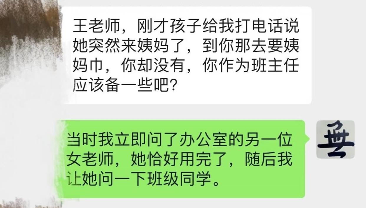 聊天对话显示,大早上,学生的妈妈表示:“王老师,刚才孩子给我打电话说她突然来姨妈了,到你那去要姨妈巾,你却没有,你作为班主任应该备一些吧?”