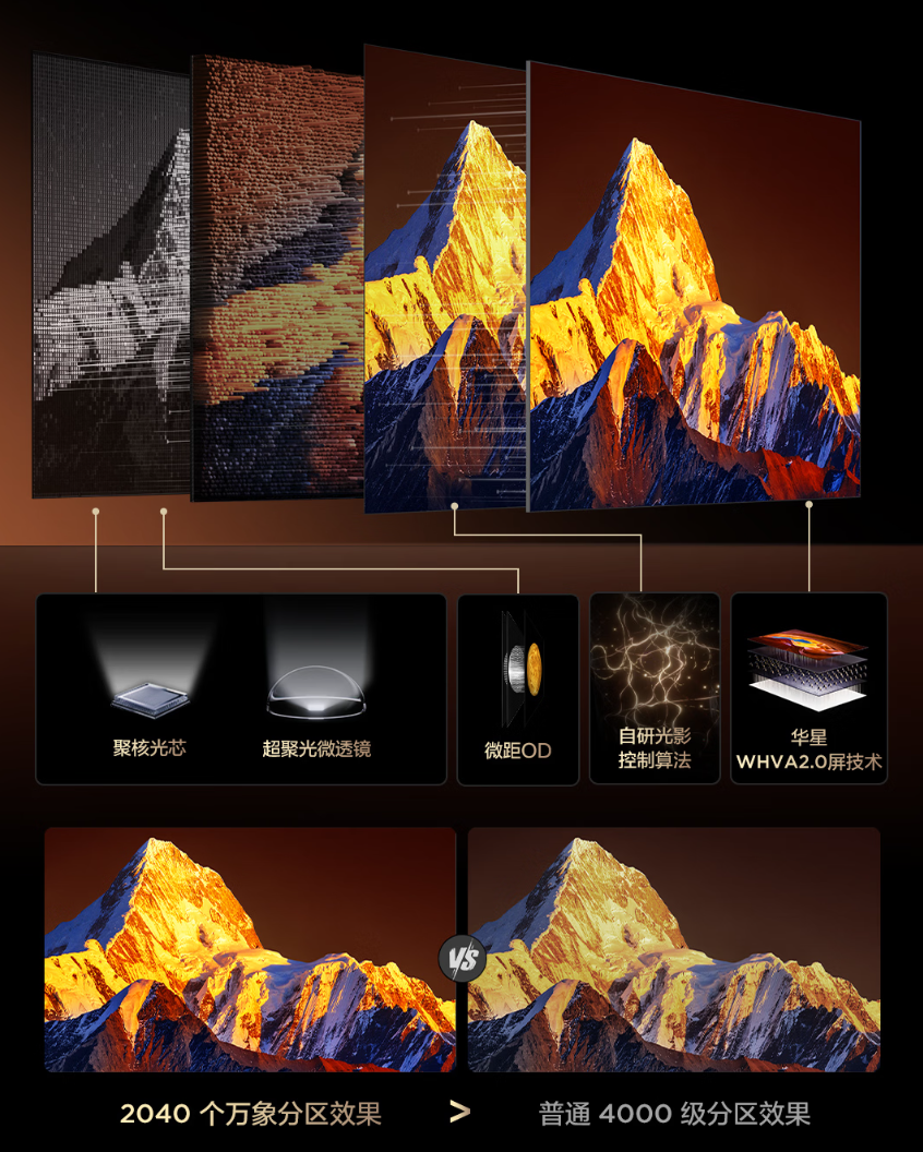 65寸的Q10M就配置了2040个万象分区,显示效果便已远超4000级普通分区,搭配绚彩XDR 5500nits的峰值亮度,让其在看高亮度画面时,能做到亮得持久、亮得出彩、亮得护眼;并且画面的黑色部分也能保持深邃,更有层次。