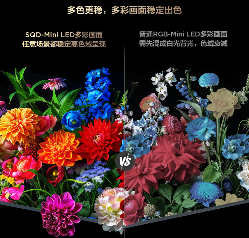 而目前市场会更为认可SQD-Mini LED技术,它不是单一的提升某一参数,而是坚守画质铁三角进行全链条的升级。其技术路径与RGB不一样,它采用的是单颗LED芯片控光,相当于一颗灯珠就是一个分区,实现像素级的控光效果,然后再通过其超级量子点材料,生成高纯度的红、绿、蓝三原色光;在三色光混合成白光后,再经由晶粹高色阻屏幕过滤杂光,从而实现高对比度、高峰值亮度、高色域,最终实现画质的显著提升。