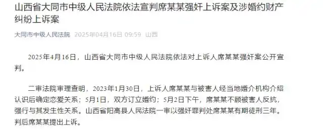 2023年1月,山西大同男子席某某与被害人经婚介机构相识并订婚。同年5月2日,席某某在被害人明确反对婚前性行为的情况下,强行与其发生性关系。案发后,被害人报警并拒绝调解,席某某因强奸罪一审被判处有期徒刑三年。其上诉后,大同中院二审维持原判,并回应公众关切: