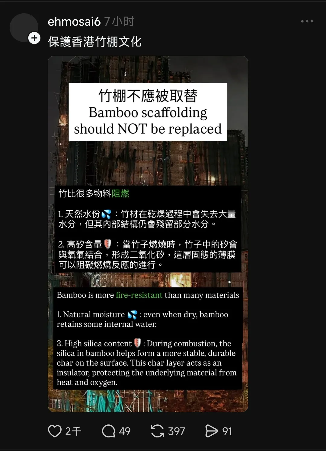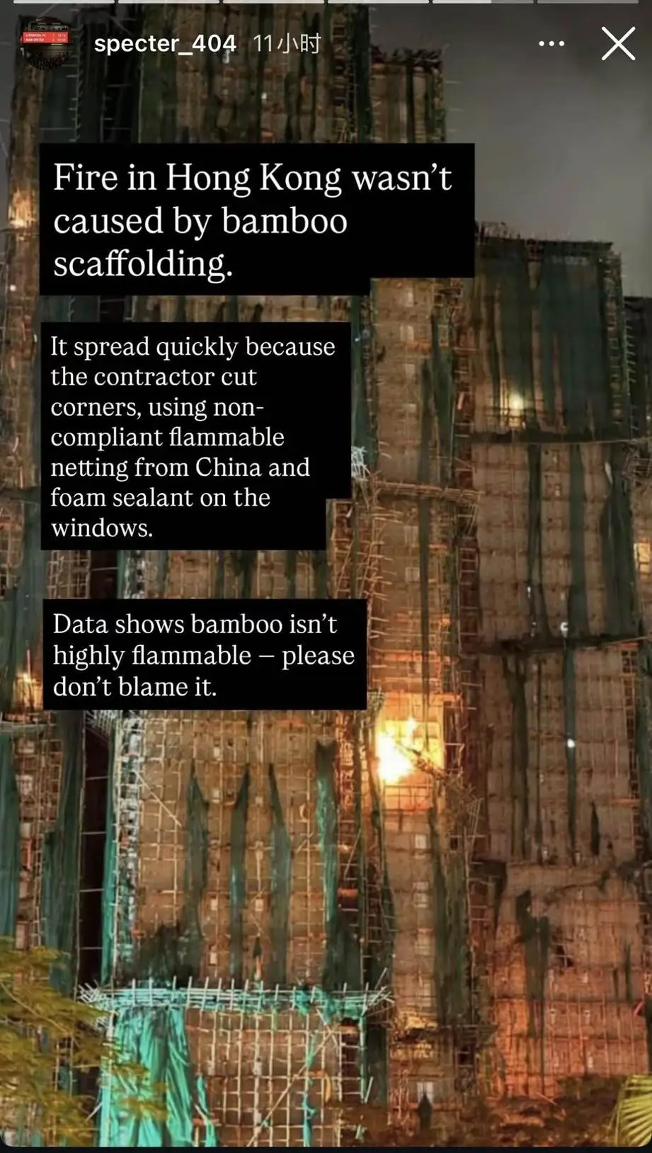 当夜幕再临维多利亚港,璀璨灯火下,不应再有被火光映红的绝望天空;香港街巷间,不应再闻亲人相拥的悲泣。每一栋高楼,都不该是隐患重重的火药桶;每一位消防员,都该能平安归家,吃上妻儿的热饭;每一个香港家庭,都该能在自己的屋檐下安心栖居,不必忧心头顶塌陷,不必惧怕墙外烈焰燃起。此外,香港多个与竹子产业相关的协会第一时间洗地行为也颇为可疑。在全世界几乎都废除了竹子脚手架的今天,香港却以所谓环保、保护传统为名顽固坚守,实属不可思议,真就是“百万漕工衣食所系”,然后就可以罔顾人命?
