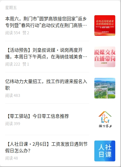 线上招聘形式持续丰富。建立企业用工动态监测机制,通过周报、月报常态化对接企业,依托“掇刀就业”公众号等平台发布岗位信息、就业政策1189篇,推送岗位12万余个,覆盖416个社群及112个居民服务群;借助“掇刀就业”视频号、抖音号开展直播带岗105期,创新推出“就业推荐官”“入企探岗”等特色板块,推介岗位4.23万个,吸引43万人次观看,让“云招聘”成为供需对接重要桥梁。