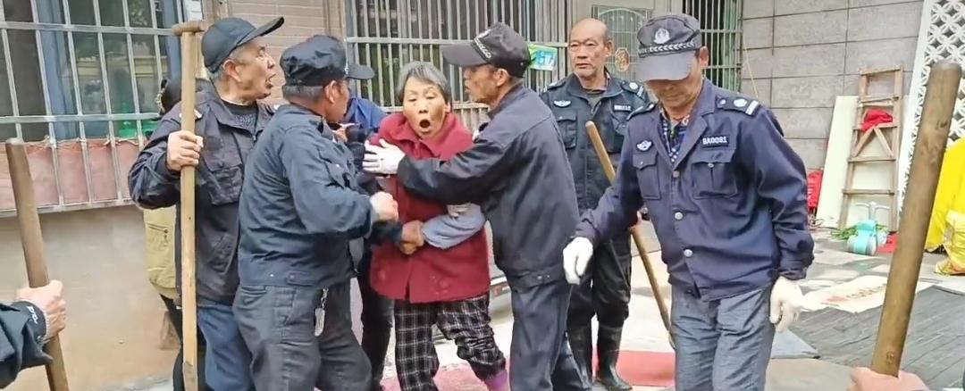 眼见越来越多的物业人员围了过来,大妈直接使出绝招躺在了地上,但好像没什么效果,于是又一咕噜的爬起来,拿起拖把想打物业大爷,但被其他物业人员拦住了。