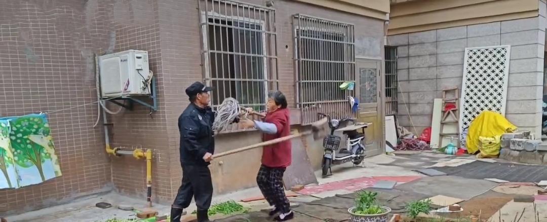 这时的王大妈得到消息后连忙跑下来阻止,见自己辛苦种的菜被物业几铲子就给毁了,大妈气得拿起一个拖把就冲上前去阻止,物业的大爷也拿着铲子阻拦,双方很快就扭打在一起。