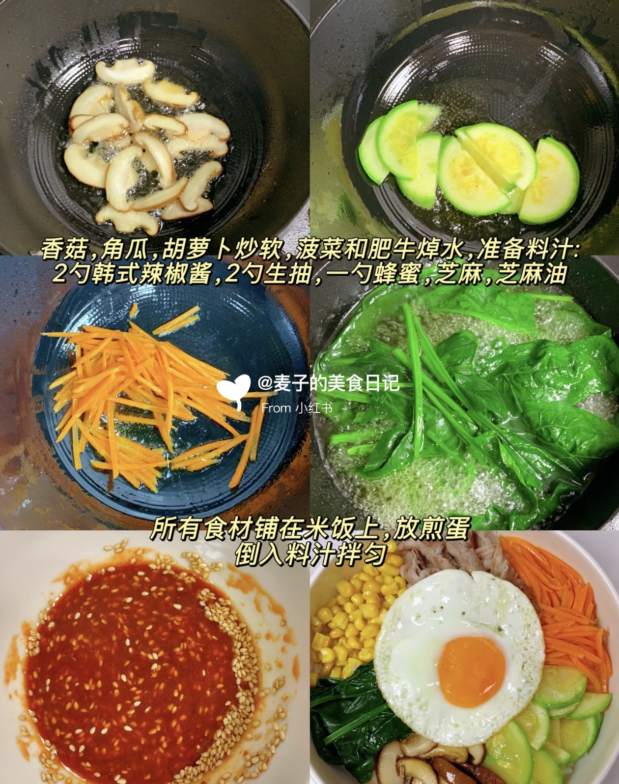 然后就到了组装的环节,找一个深一点的碗,铺上满满一碗热米饭,把处理好的食材依次码在米饭上:煎好的香菇和角瓜、炒软的胡萝卜丝、挤干水分的菠菜、煮好的肥牛,再撒上一把甜玉米粒,最后在中间放一颗煎得焦香的荷包蛋,金黄的蛋黄微微流心,看着就格外诱人。这一步不用讲究太多摆盘技巧,只要把食材整齐地铺在米饭上,色彩丰富又有食欲,拍照发朋友圈也超好看。