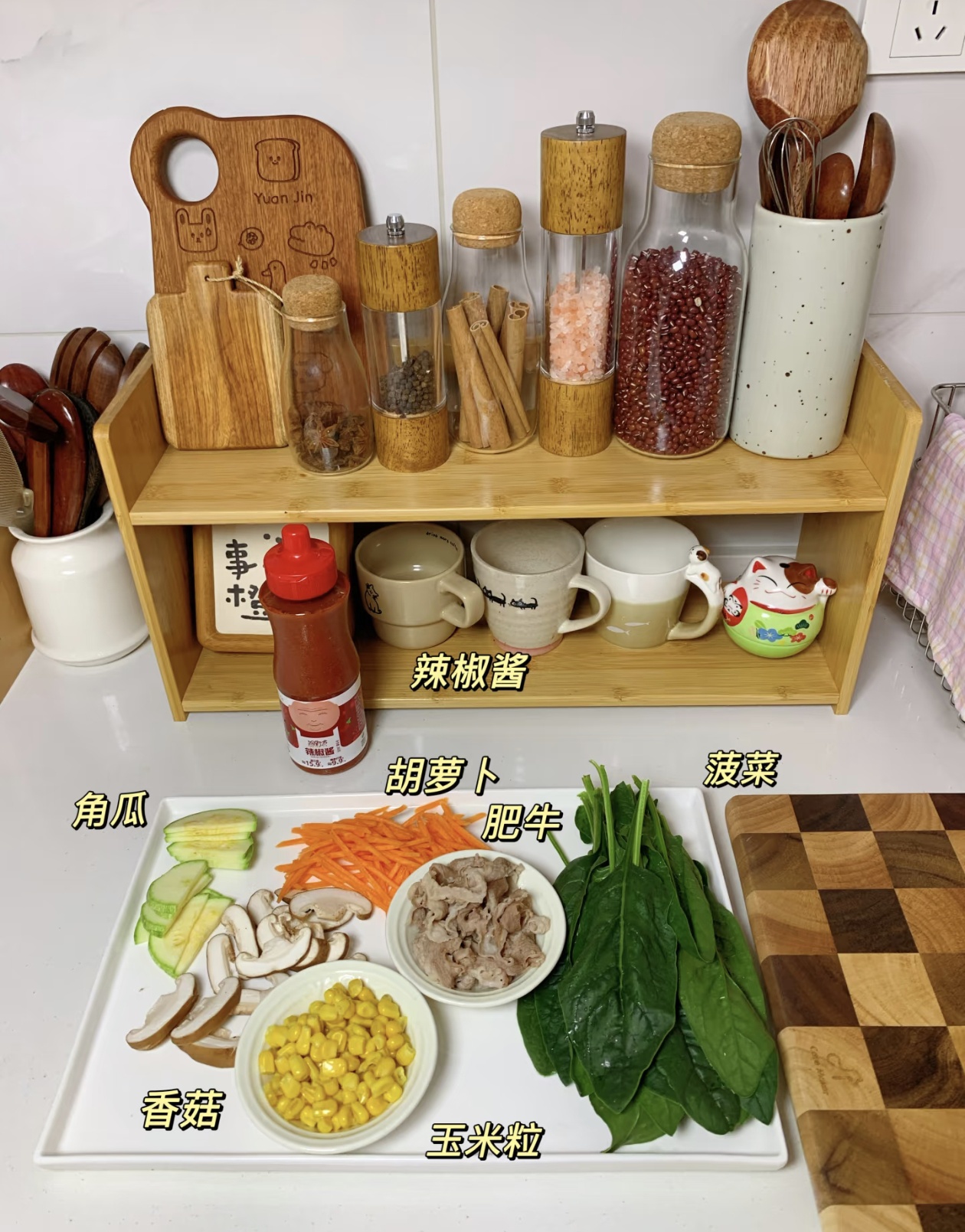 先准备好所有食材:角瓜、香菇、胡萝卜、菠菜、肥牛、玉米粒,还有一颗鸡蛋和灵魂料汁。角瓜和香菇洗净切片,胡萝卜切成细丝,菠菜择去老根洗净备用,肥牛卷可以提前从冰箱拿出来解冻。料汁是这碗饭的精髓,取一个小碗,放入2勺韩式辣椒酱、2勺生抽、1勺蜂蜜,再撒上一把熟芝麻,最后淋入少许芝麻油,搅拌均匀后,酸甜微辣的香气就飘了出来,光是闻着就让人食欲大开。