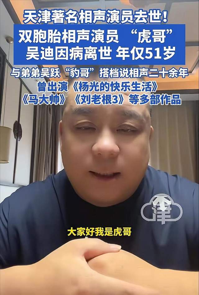 还有天津那对特别有名的双胞胎相声演员“虎哥豹哥”里的虎哥吴迪,去年6月也是突发脑溢血,51岁就走了,他弟弟豹哥在网上哭着悼念的视频,看得人心里发酸。