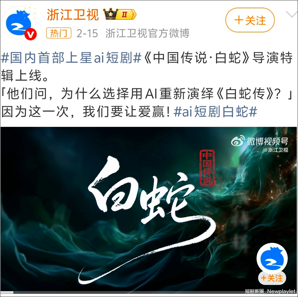 大年初一,一部名为《中国传说·白蛇》(以下简称《白蛇》)的AI短剧登上浙江卫视。这是国内第一部上星的AI短剧。浙江卫视大家都不陌生,今天我们来重点讲讲《白蛇》背后的制作方——九紫源AI。