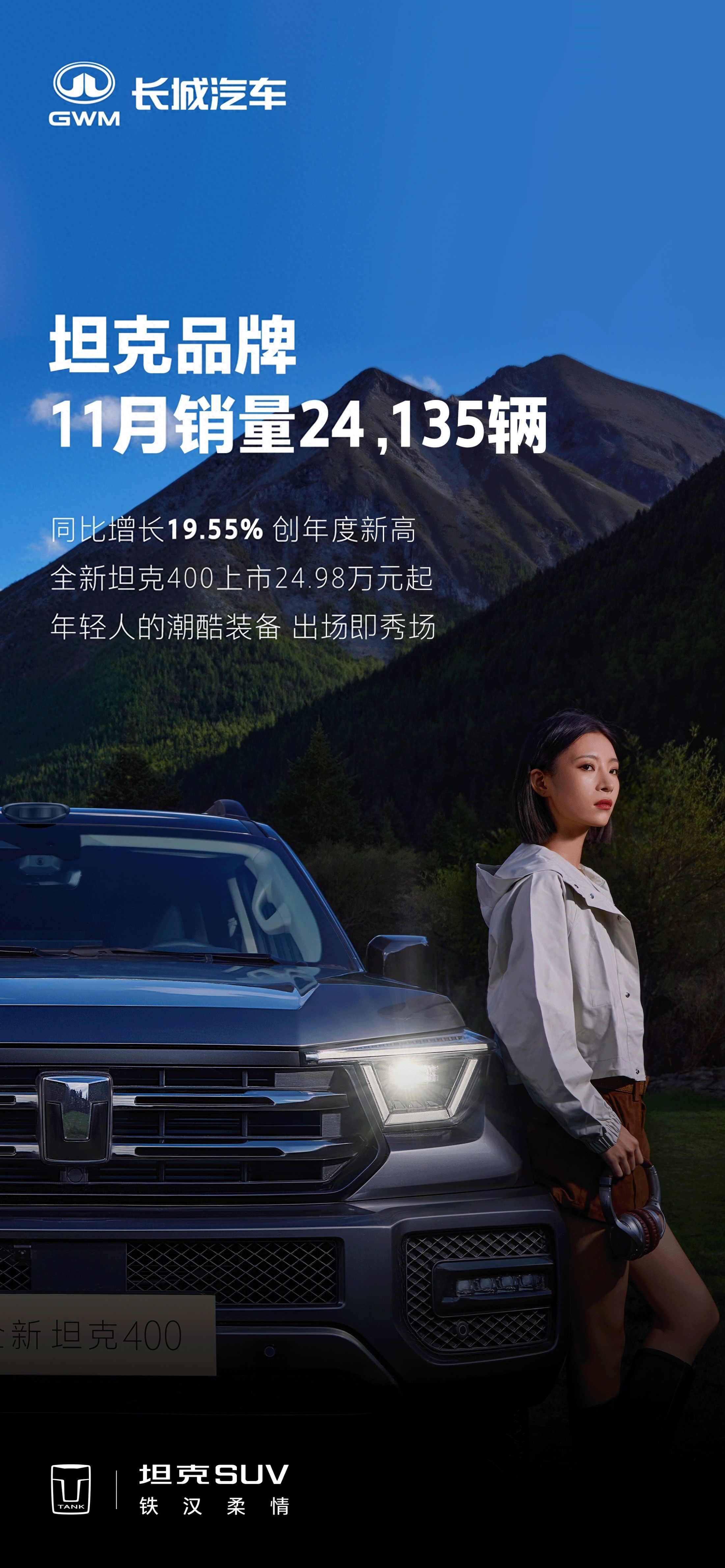 近日,坦克品牌公布了11月销量战报,当月销量达24,135辆,同比飙升19.55%,创下全年月度销量新高。尤为引人注目的是其在新能源与高端市场的双重突破:其中,新能源车型销量为14,553辆,占总销量的60.3%;售价30万元以上的高价值车型销量为12,644辆,占比高达52.4%。这一系列数据表明,坦克品牌在高端化、新能源转型战略上已取得显著成效。