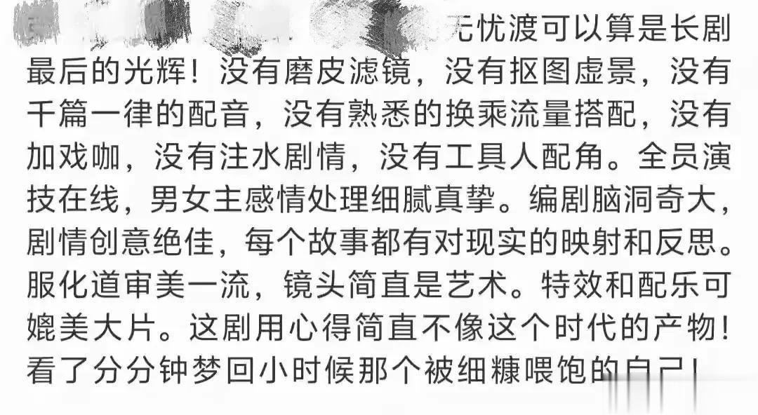 对于这部剧,和《无忧渡》一样,个人认为编剧、导演、演员、后期全方面给力,更难得的是,追剧时多了份热泪盈眶。