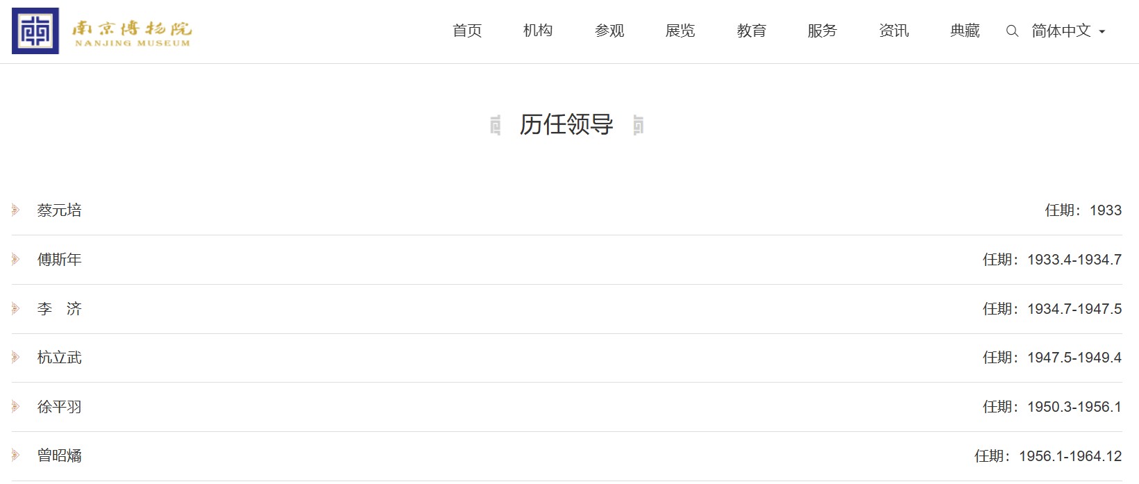 南京博物院官网“历任领导”一栏依次列出蔡元培、傅斯年、李济、杭立武…