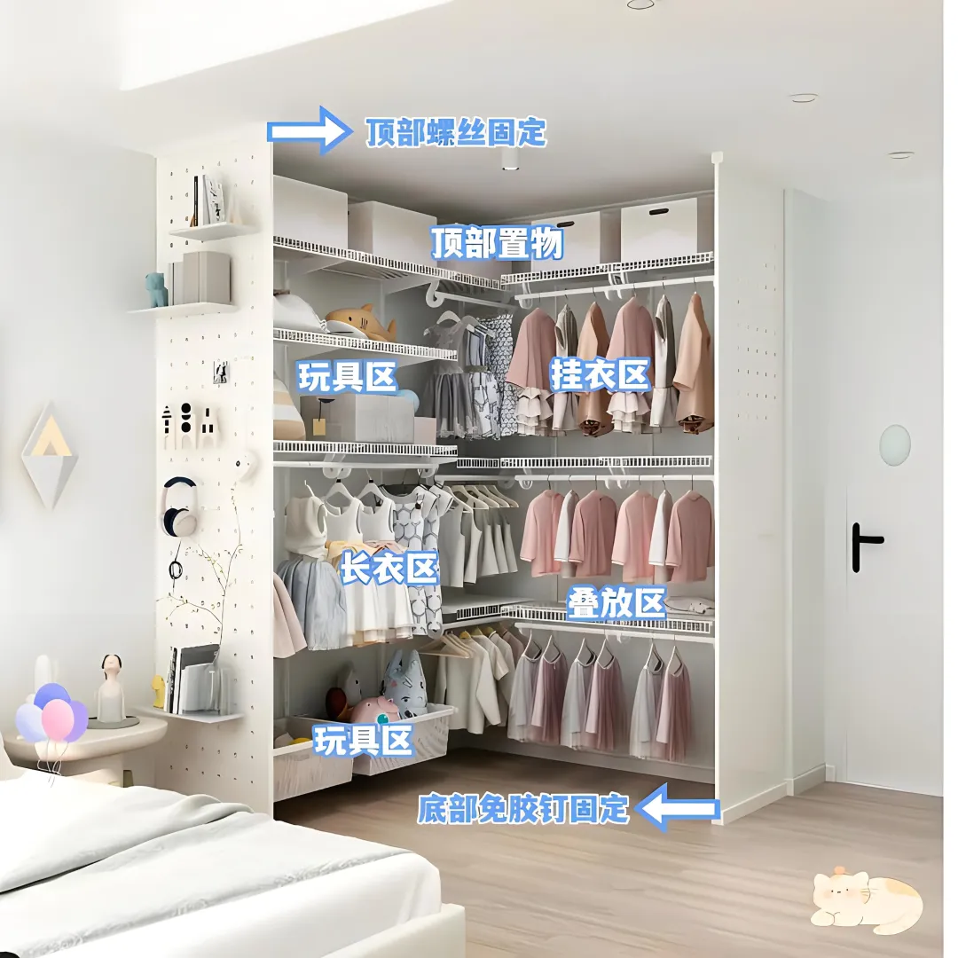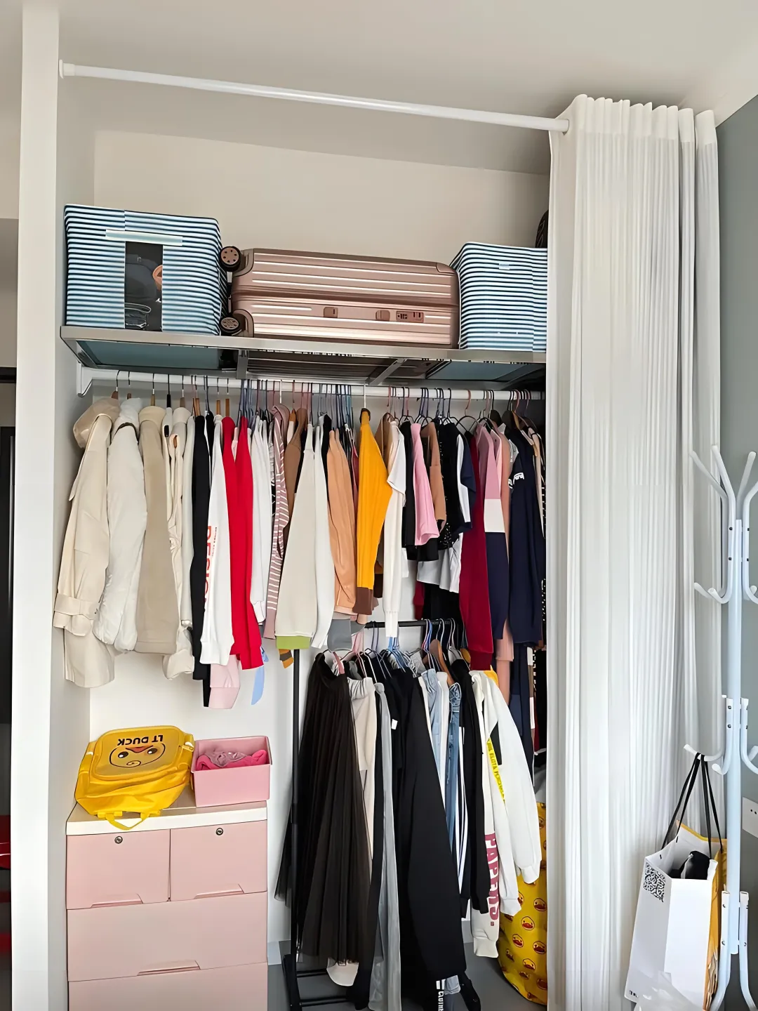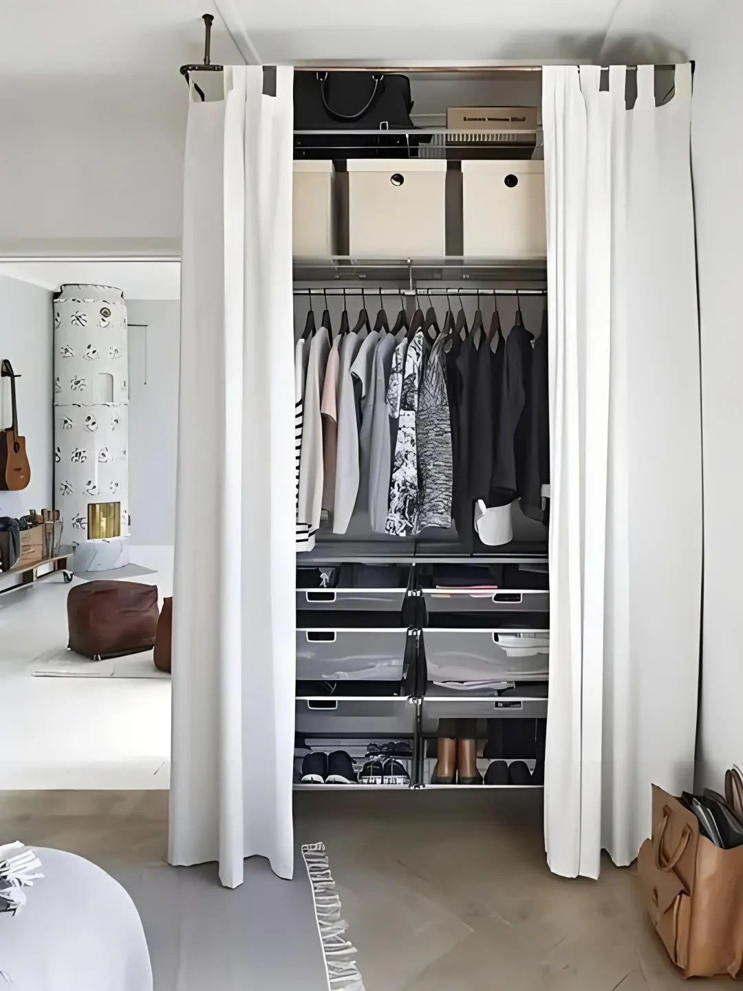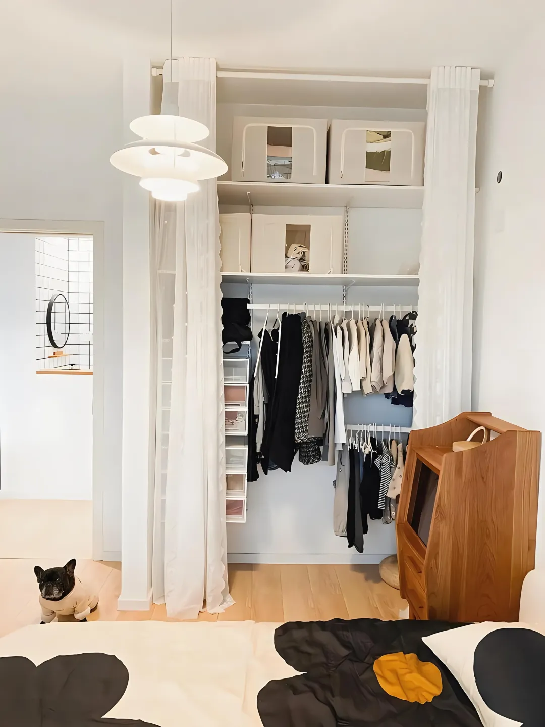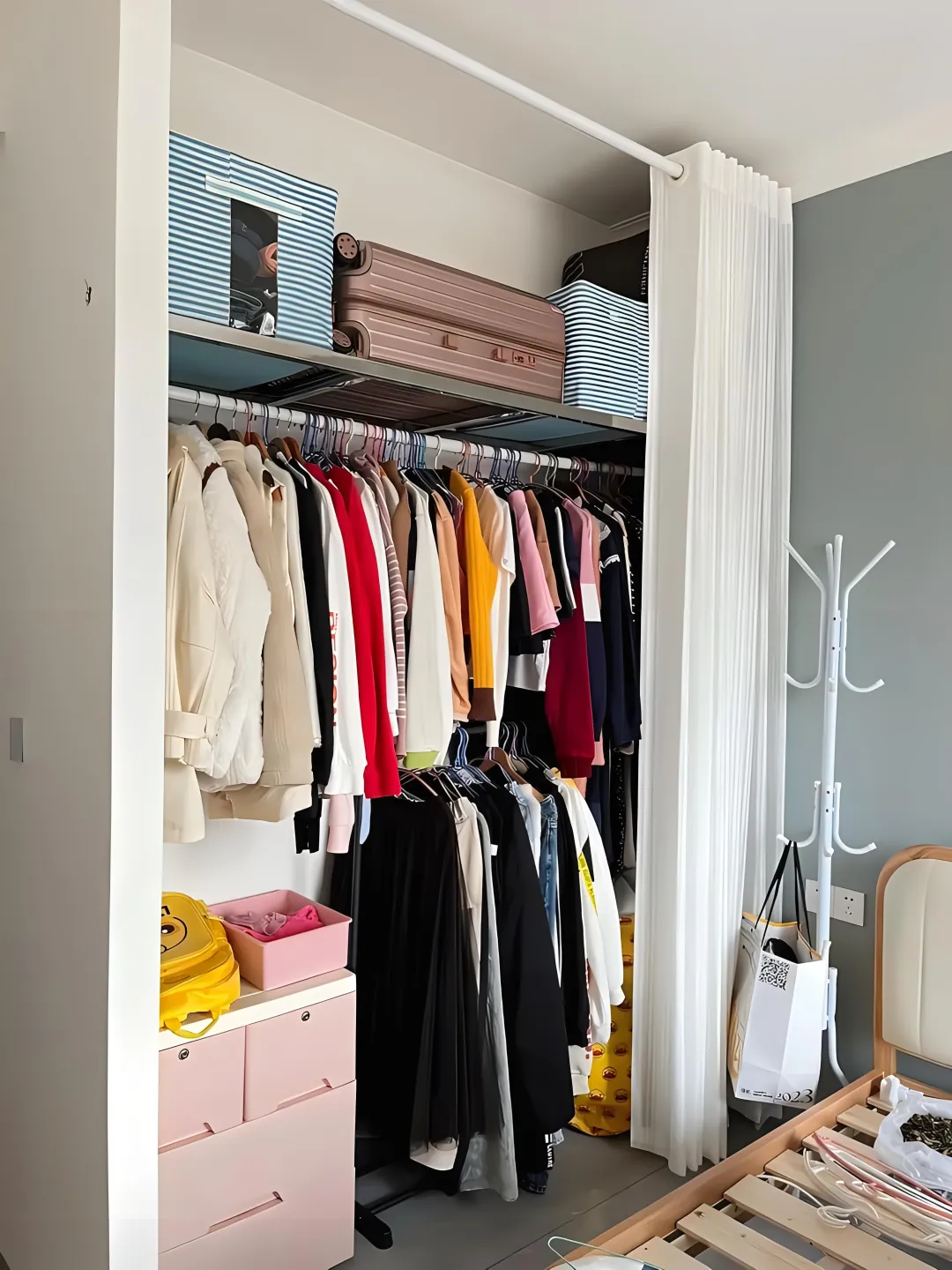 使用布艺帘结合“砌墙”衣柜,我们只需要用金属支架、隔板和窗帘即可轻松打造一款既美观又实用的衣柜。