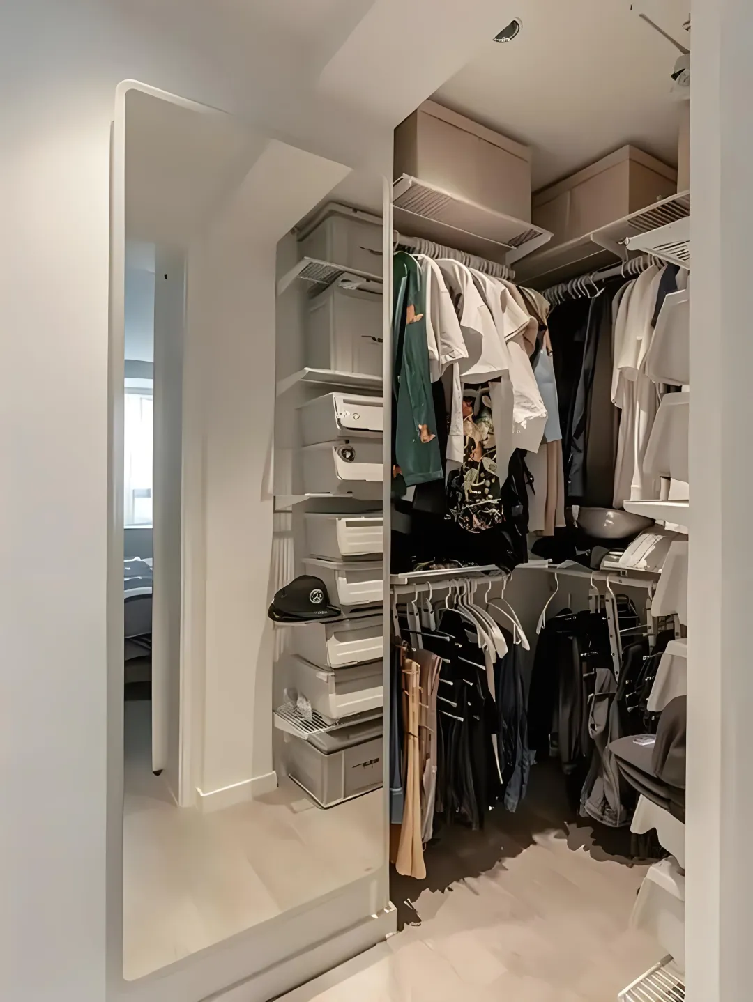 如果担心小件物品过于混乱,可以增加一些抽屉,这不会对整体造成太大的影响。当然,这种设计更适合独居或者衣物不是很多的情况下。如果有宠物,就需要谨慎考虑了。