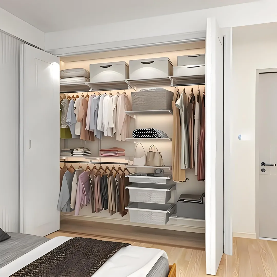 将折叠门与“砌墙”衣柜搭配使用,柜门完全打开时不会占用额外空间,方便日常取物;柜门关闭后,衣柜的整体感强,既美观又实用。