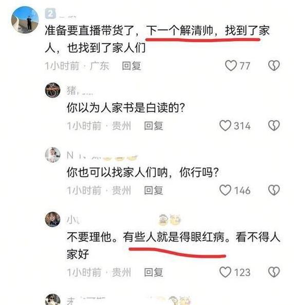 评论区中也有观点认为,解清帅的这一行动是为了收徒,打算让谢浩男涉足直播带货领域。他们的经历相似,且人气都极为旺盛,目前谢浩男的粉丝数量已超过50万。相信谢浩男将成为下一个解清帅,不仅找到了亲人,还结识了“亲友们”!