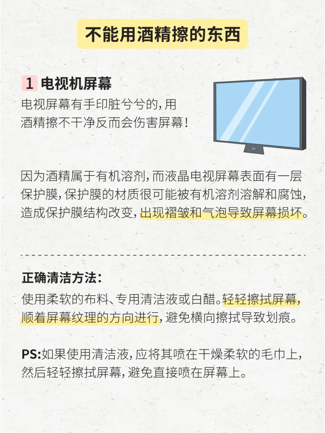 觉得液晶电视屏幕脏了,也用酒精擦拭,一下就把液晶电视上的涂层擦掉了,使电视变得斑驳。