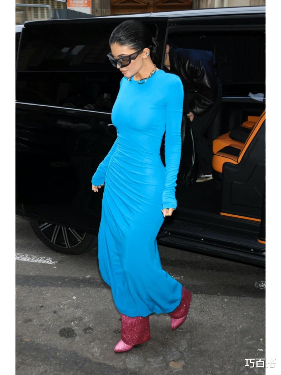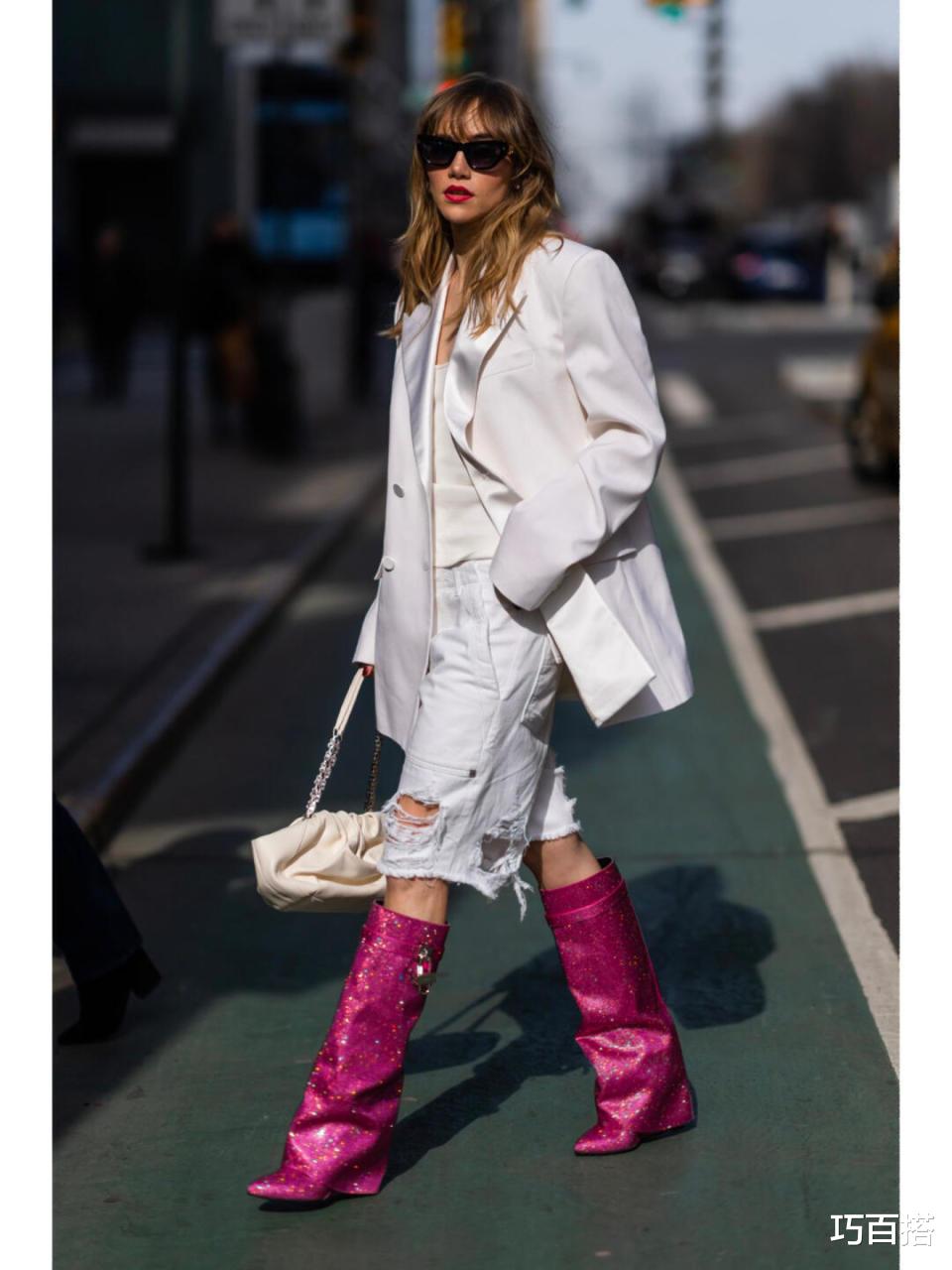 裤管靴在配色上,也几乎没限制,蓝色紧身连衣裙搭配粉色高跟裤管靴,撞色模式时髦亮眼,裙子存在感强但鞋子存在感也不弱,很轻松就实现了1+1>2的效果。