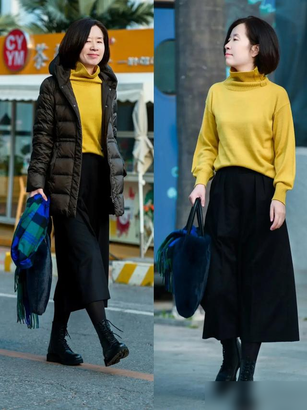 50+姐妹记牢:同色系要分深浅,上浅下深显高,上深下浅显稳——小个子选上浅下深,显高10cm;微胖姐妹选上深下浅,藏肉又大气。