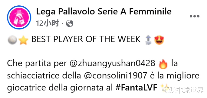 意甲官方在本轮赛后还发布社交贴文称:“庄宇珊打出了一场怎样的比赛!”并配上她怒吼的照片,同时询问球迷:“你有把她放进梦幻首发阵容吗?”引发热烈互动。