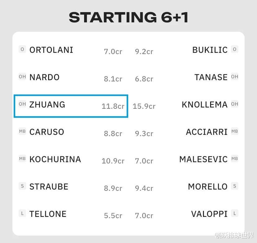 在FantaLVF推荐的“理想首发阵容(Starting 6+1)”中,庄宇珊作为主攻被重点推荐,市价达到11.8cr,价值稳步增长。在FantaLVF这类梦幻体育游戏中,玩家会在一个虚拟预算范围内组建自己的“梦幻球队”,每个球员都有一个对应的credit值(cr),这个值会根据球员的实际比赛表现不断波动,包括初始值是根据球员实力、位置、市场热度等设定起始价格。