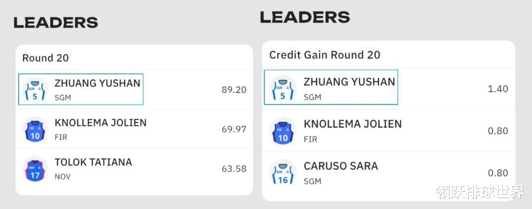 在FantaLVF官方公布的第20轮球员评分榜中,庄宇珊以89.20分强势登顶,远超其他对手,排在她之后的是荷兰球员乔琳·克诺莱玛69.97分,以及塔蒂亚娜·托洛克63.58分,庄宇珊不仅赢得最高得分,同时也在“价值增幅排行榜”中以+1.40名列第一,成为名副其实的“双榜冠军”。