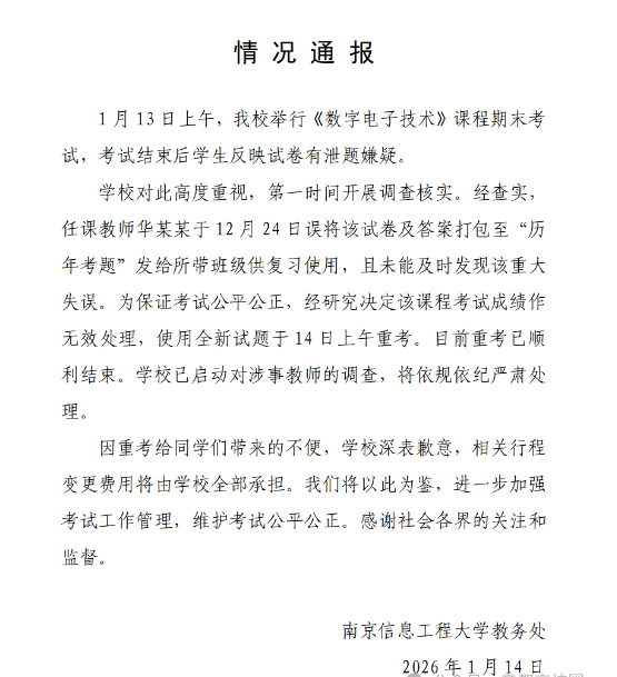 果然当天,南京信息工程大学教务处发布了消息,该校在1月13日上午进行的《数字电子技术》课程期末考试中存在泄题的情况。