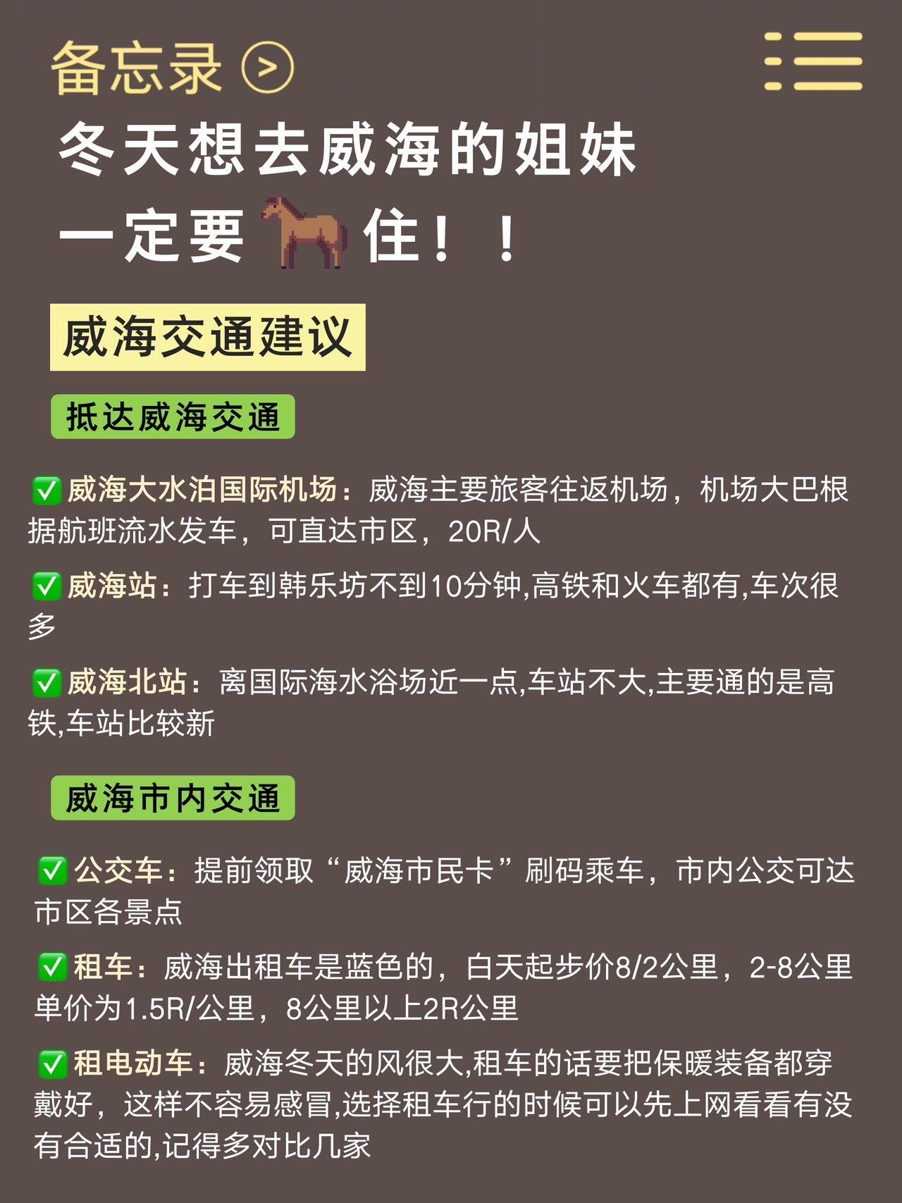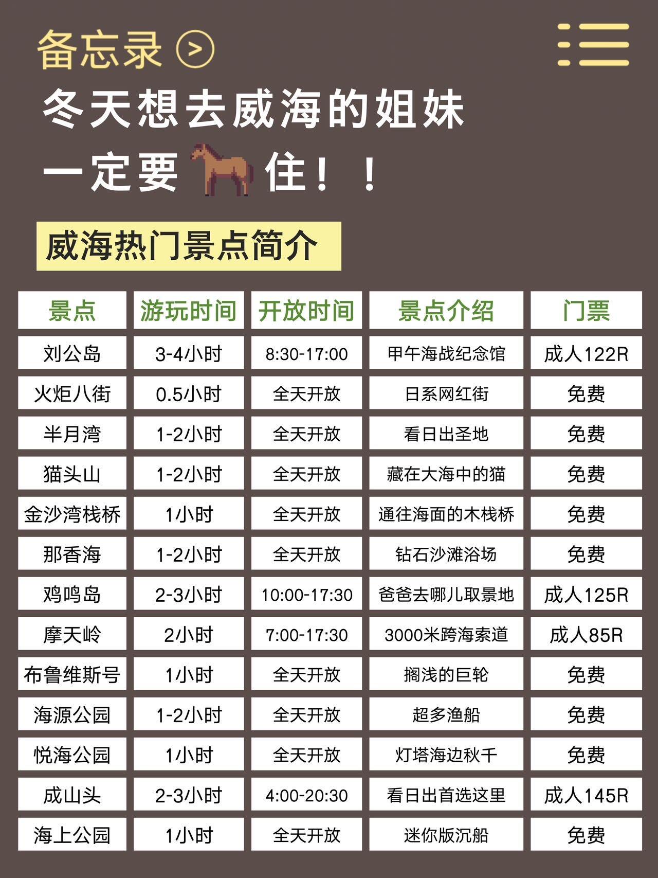 ✅像热门景点如火炬八街、海水浴场、半月湾、小石岛、幸福门都是免费🆓,公交就能到,很方便的。🏝️刘公岛要收费,冬季博物馆关得早,去前要问清楚,不然白跑一趟。而布鲁维斯沉船🚢、成山头那些地方较远,建议开车去🚕