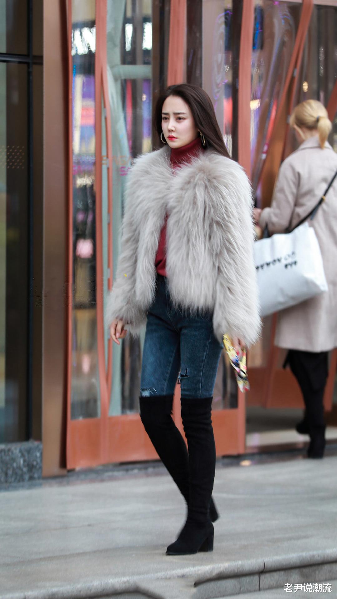 美女选择是浅灰色毛绒皮草短外套,蓬松的质感尽显温柔大气;酒红色高领针织衫,为整体增添一抹浓郁色彩;搭配蓝色破洞紧身牛仔裤,随性的破洞设计注入街头感;脚蹬黑色过膝高跟长靴,既修饰腿型又提升气场,整体穿搭在温柔与酷感间实现了巧妙平衡,时尚又有格调。
