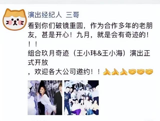 可就在8月30号晚上,有位经纪人发出王小海和王小玮复婚的消息。