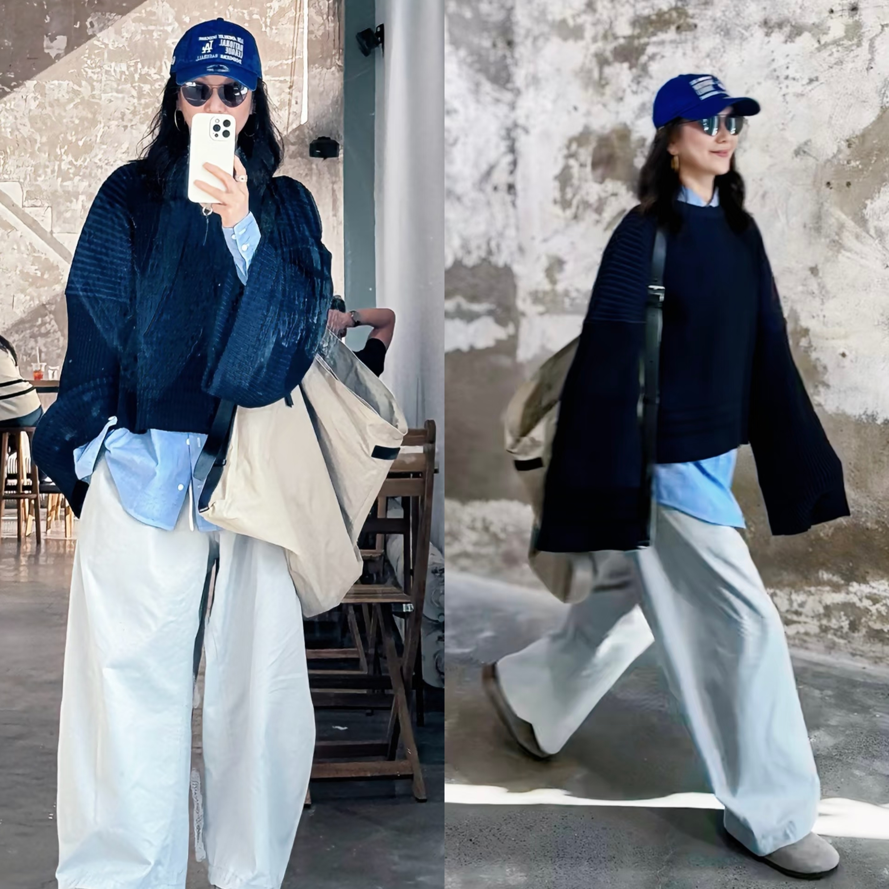 比如↓这位50+博主,宽松的藏蓝色毛衣,内搭蓝衬衫叠穿,搭配一条浅灰色休闲裤,全身搭配偏宽松。头上的棒球帽和肩上挎的大帆布包与造型很好呼应,进一步强调慵懒年轻气质,松弛感拉满。