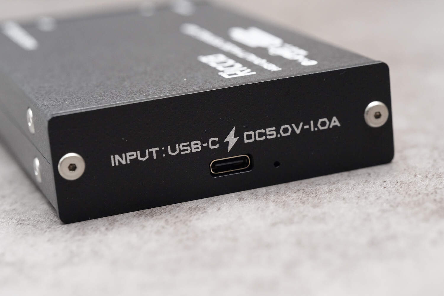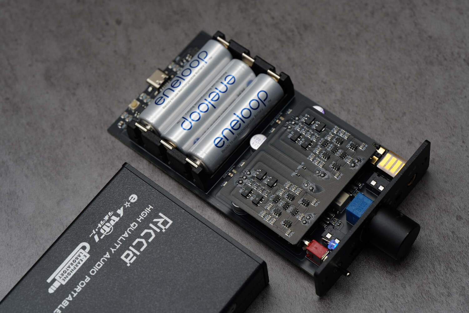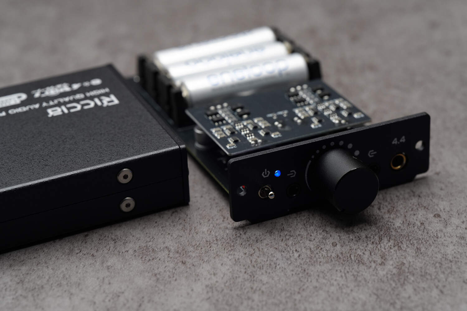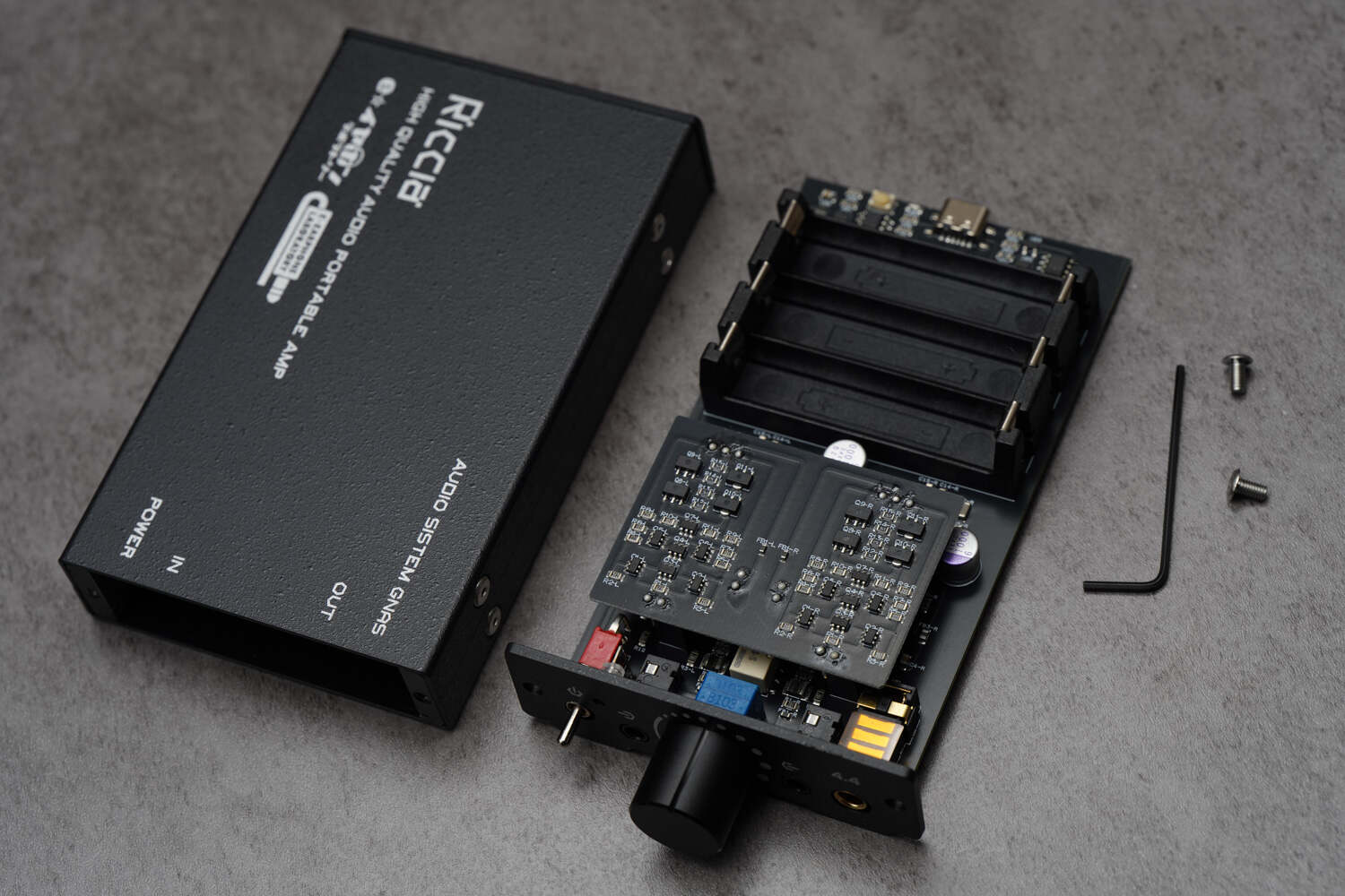 外观部分没有太多可说的,就是典型的便携耳放“酒壶”造型,板正的长方体金属机身,接口和开关主要集中在前面板上,包括拨杆式电源开关、音量滚轮以及3.5mm LINE IN接口、3.5mm和4.4mm耳机输出口。机身后部为TYPE-C充电接口。Riccia便携耳放的机身是比较低调的材质,在耐划伤方面有不错的表现,捆绑使用时紧靠播放器背面也不用担心(相互)产生明显划痕。由于是可换模块卡设计,Riccia的机身外壳是可以拆卸的,通过随付的L型螺丝刀拆掉面板上的两颗螺丝就可以"滑"出外壳看到机身内部。此时可以发现,Riccia的供电不是使用锂电而是三节AA电池(祖传的ENELOOP终于可以出场了),并且可以通过TYPE-C口进行充电;AA电池的泛用性使得Riccia在供电方面灵活且方便。而机身内可以清晰看到左右声道分离的电路设计,以及可插拔的模块卡。更换模块卡是通过对应位置的针脚进行安装的,只要插拔时保持模块卡和机身的基本平行,加上针脚位置的防呆设计,操作并没有什么风险和难度。Riccia的整体体积和厚度控制得比较好,比目前主流大屏触摸播放器要小一丢丢,厚度也不过分,使用绑带贴在一起,看上去也不算夸张。