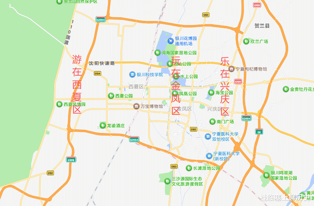 但是,要是细分细看来说,而在这幅宏大的图景里,发现一个特别有意思的现象,那就是好像不知不觉间,银川市辖三区(兴庆区、金凤区、西夏区),好像各自形成了截然不同的性格,甚至被贴上了清晰的标签:“乐在兴庆,玩在金凤,游在西夏”。