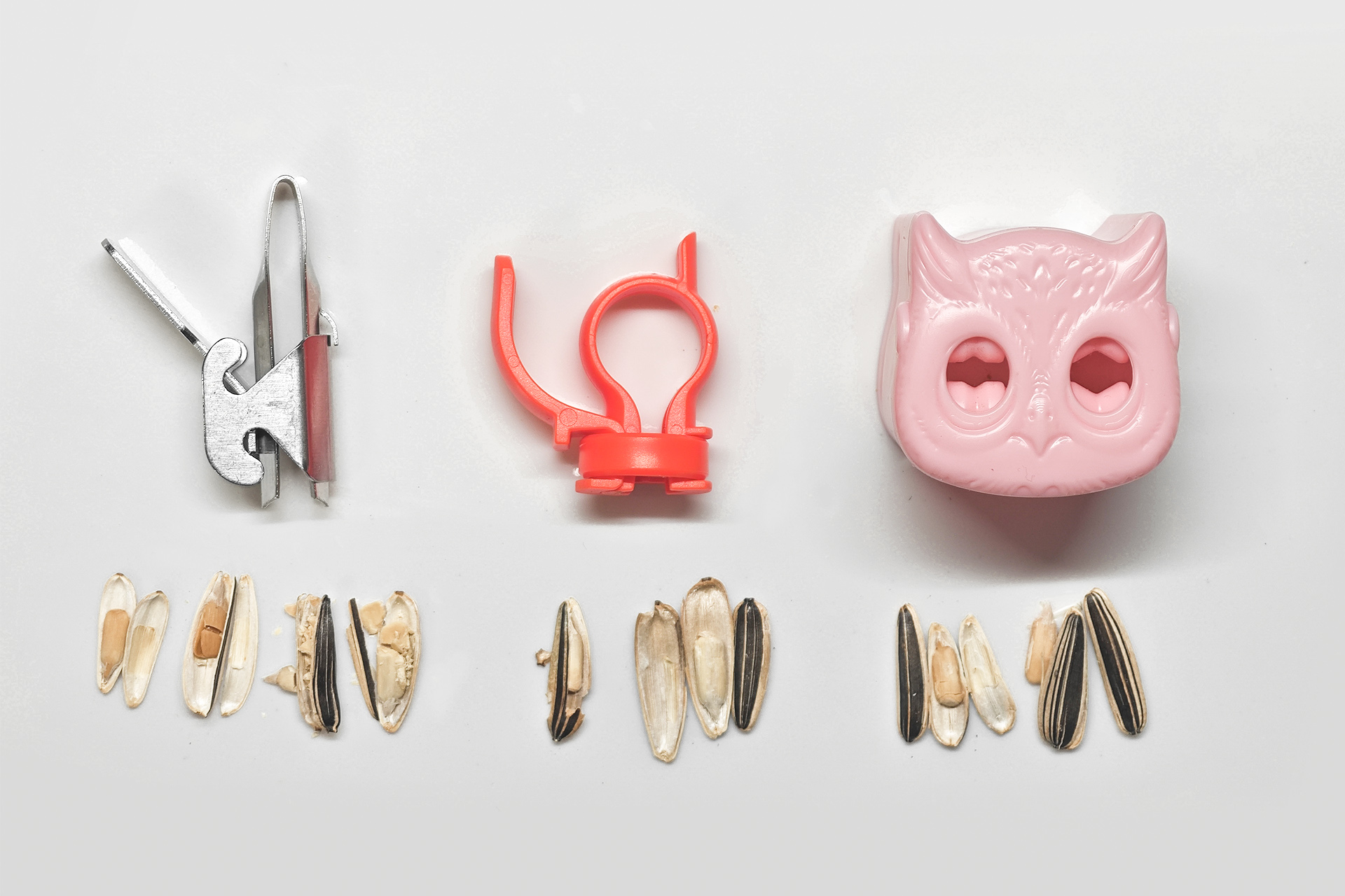 经过大人小孩几轮接力,挨个尝试了10多颗瓜子后,最终战力对比,金属夹由于下压夹口更大,相对能获得更高的开壳率,但碎瓜子仁的概率也高。橙红夹绝大部分都只能给瓜子裂开一条缝(还有一些瓜子完全不开缝),需要依靠手动继续拨开瓜子壳,所以图里显得瓜子仁比较完整,那都是手动剥开的。猫头鹰夹子我绝大部分时候用的较小哪个左眼,因为大瓜子塞入右边大眼,经常不开壳,需要用力塞入左边,依靠大压差才能崩开壳(小孩就更难操作),瓜子仁完整度还行,裂开概率低于金属夹。