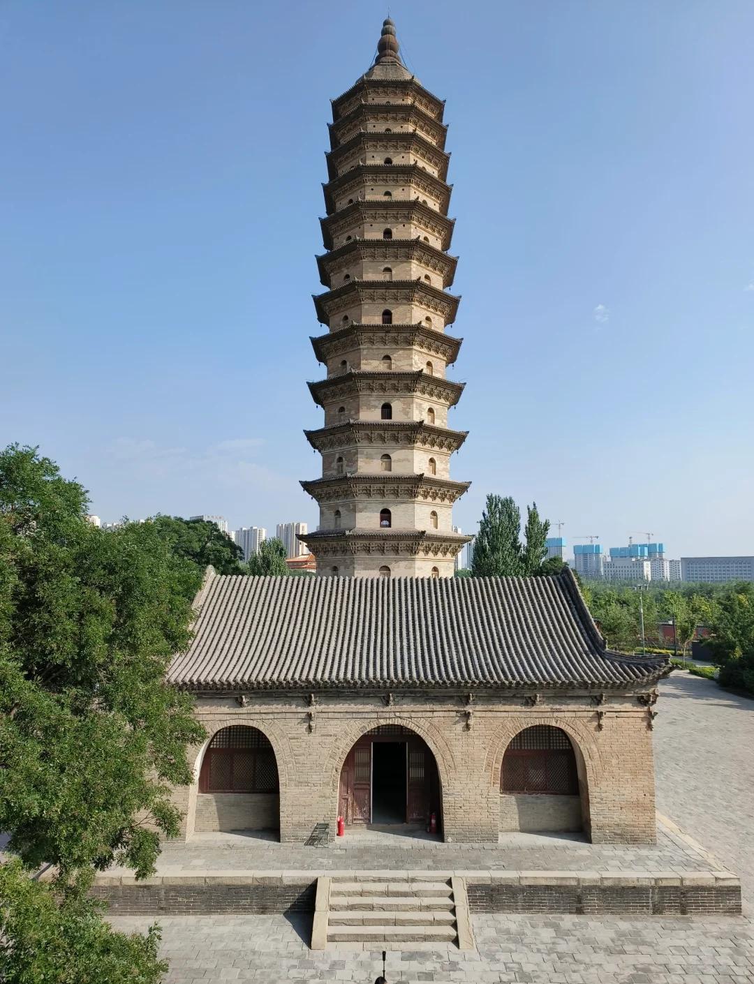 一、建筑解码:凌霄双塔的“力学与美学史诗”永祚寺的灵魂,在于那对“并肩而立”的明代砖塔——文峰塔与宣文塔(合称“凌霄双塔”),二者相距46米,高度均为54.76米,是中国现存双塔中形制最统一、保存最完整的明代砖塔群,被誉为“太原城的脊梁”。