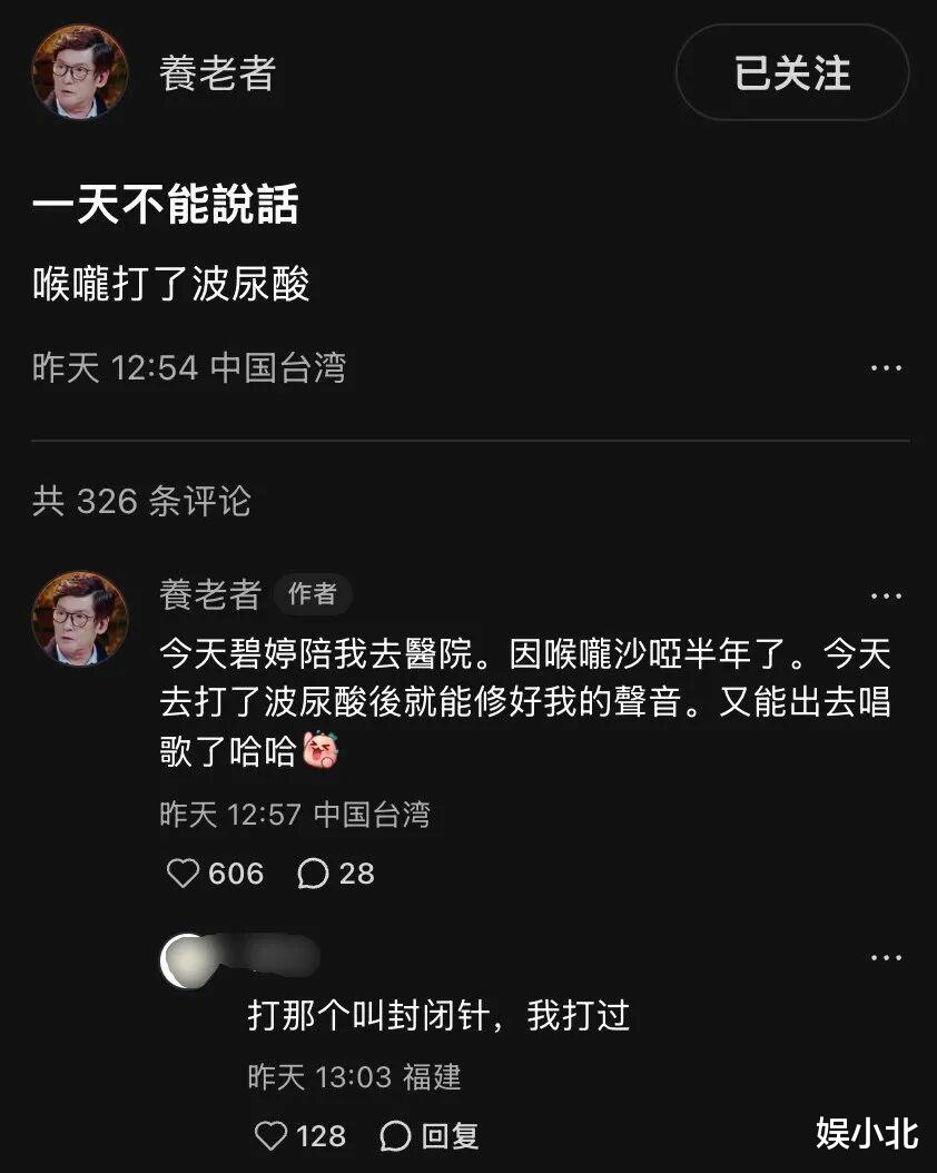 患癌的郭爸爸,嗓子沙哑有半年时间了,11月18号才在郭碧婷的陪伴下去医院打了封闭针。