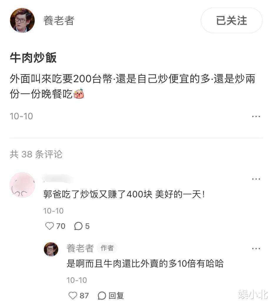 所以他能自己做饭就自己做,想吃牛肉炒饭就自己炒,炒完之后还不断感慨:外面点要200台币,自己炒更便宜,还能炒两顿。