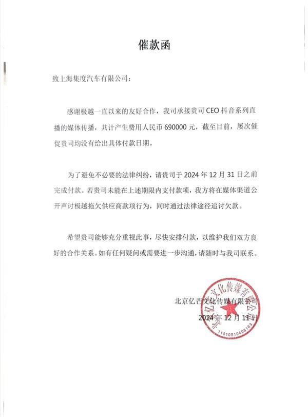 近日,一封盖有公司印章的催款函流出,催款方为“北京亿芒文化传媒有限公司”,被催款方是上海集度汽车有限公司,也就是大家更为熟悉的极越。